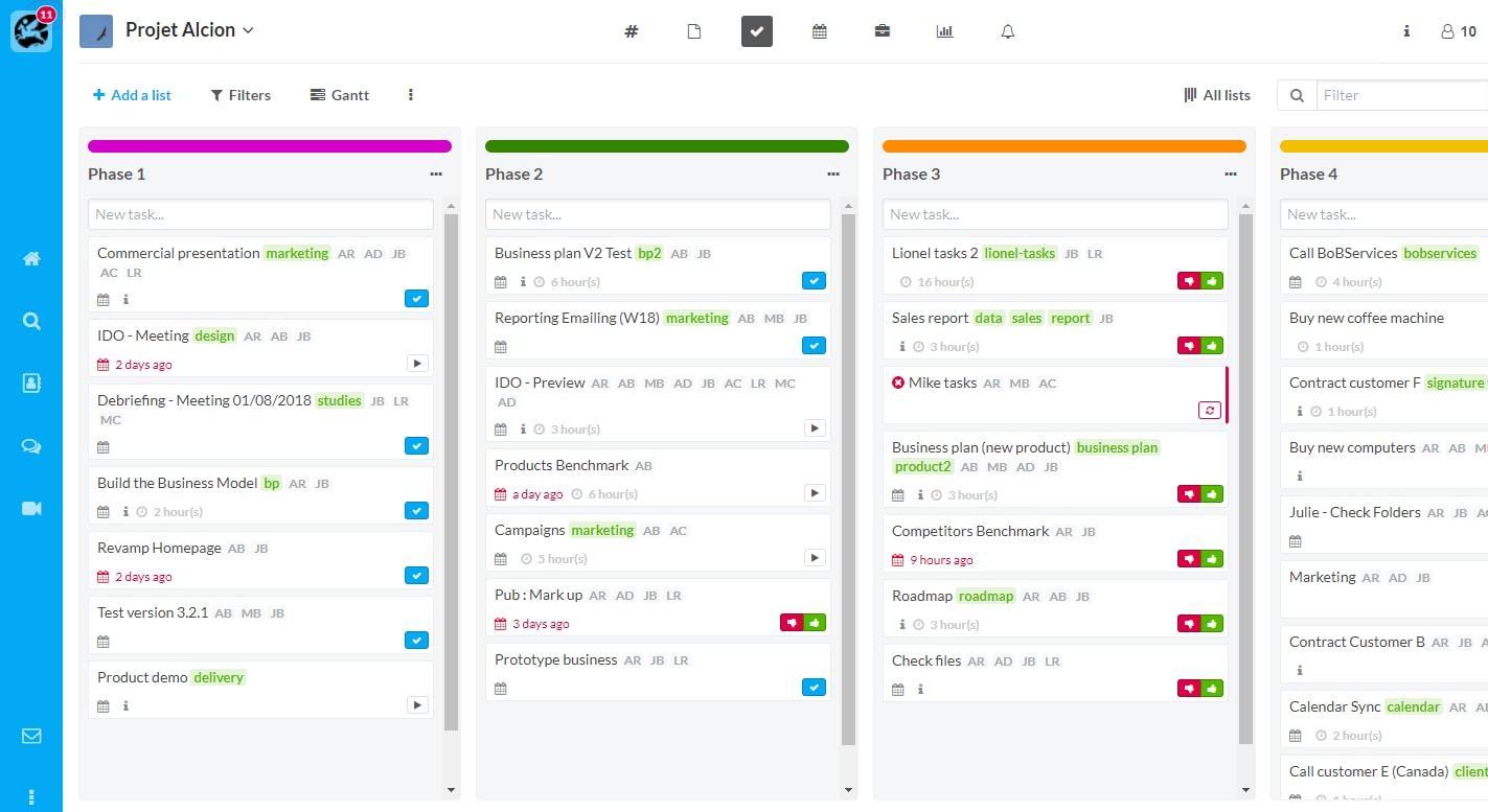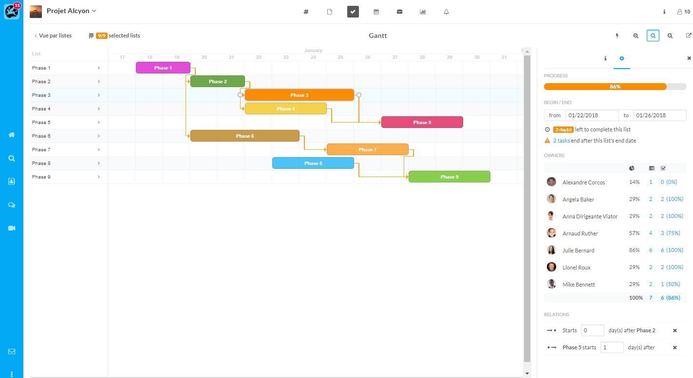 - Gestion de tâches : gérez aisément les tâches de vos projets et équipe ! visualisez vos tâches en un clic, filtrez, importez et exportez vos listes de tâches de manière sécurisée. Wimi Armoured vous propose afin de suivre l'avancement de vos projets un Diagramme de Gantt simplifié.
