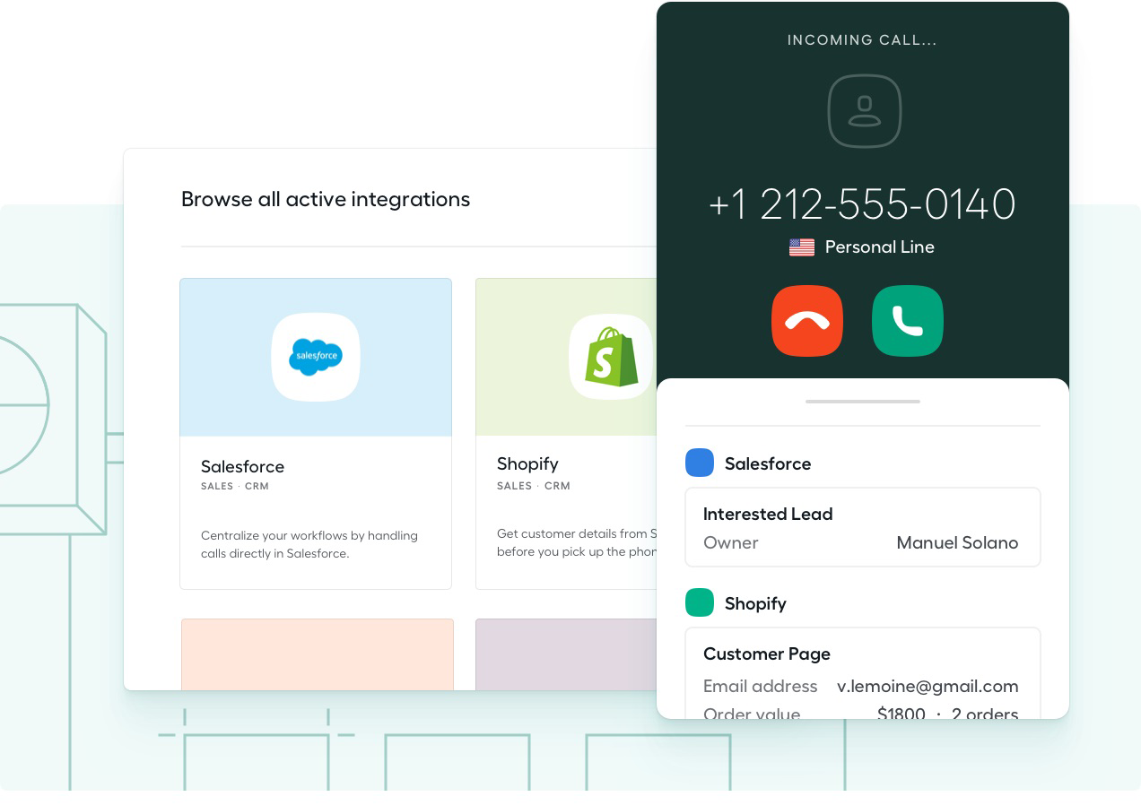 Grâce à l'internet haut débit et au téléphone IP, Aircall offre une vingtaine d'intégrations natives avec les outils de CRM et helpdesk les plus populaires ainsi qu'une API vous permettant d'utiliser Aircall avec n'importe quelle autre solution IP.