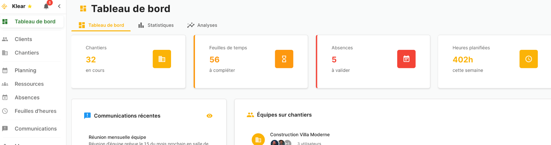KLEAR - Tableau de bord Klear permettant de planifier les chantiers, suivre l’avancement des travaux et communiquer avec les équipes terrain en temps réel.