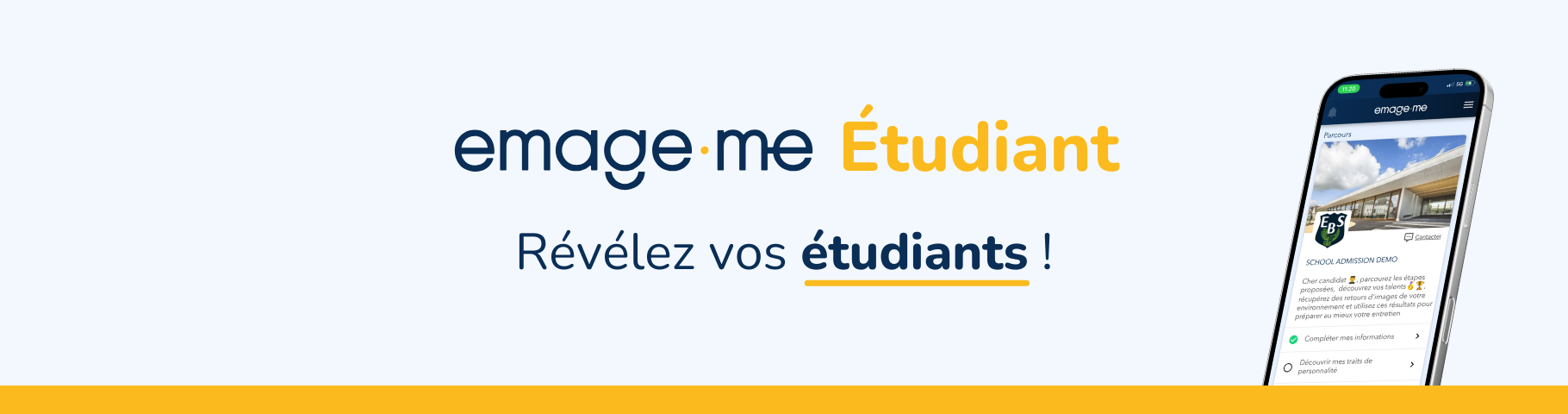 emage-me Étudiant 🟨 est une solution digitale innovante pour révéler les talents, développer les soft skills et accompagner chaque étudiant dans son orientation et son employabilité.