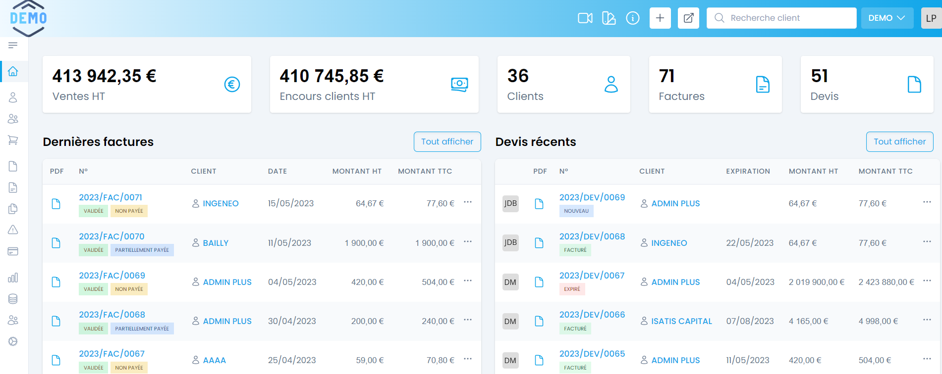 - CRM intégré pour la gestion des clients, contacts et devis