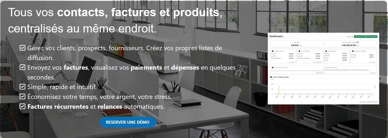 Solution de comptabilité en ligne pour les TPE/PME. Facturation et suivi des dépenses en temps réel. Gestion des stocks et des clients simplifiée.