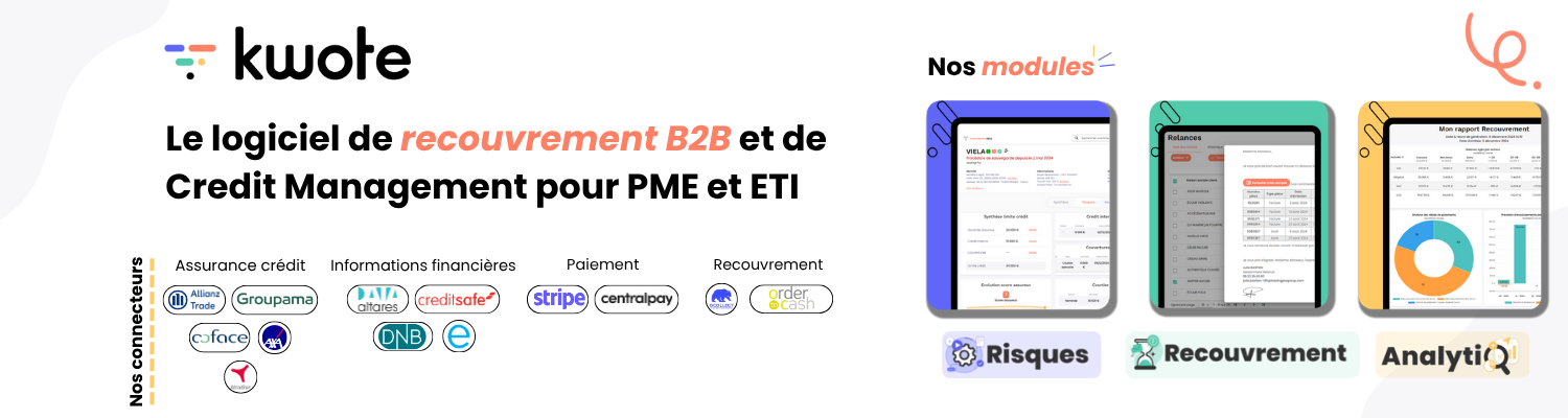 kwote est un logiciel SaaS de credit management conçu pour aider les PME et ETI à piloter leur poste client avec efficacité. Grâce à ses trois modules Risques, Recouvrement, AnalytiQ. kwote vous permet d’anticiper les impayés, d’optimiser vos relances et d’avoir une vision claire de votre trésorerie.
