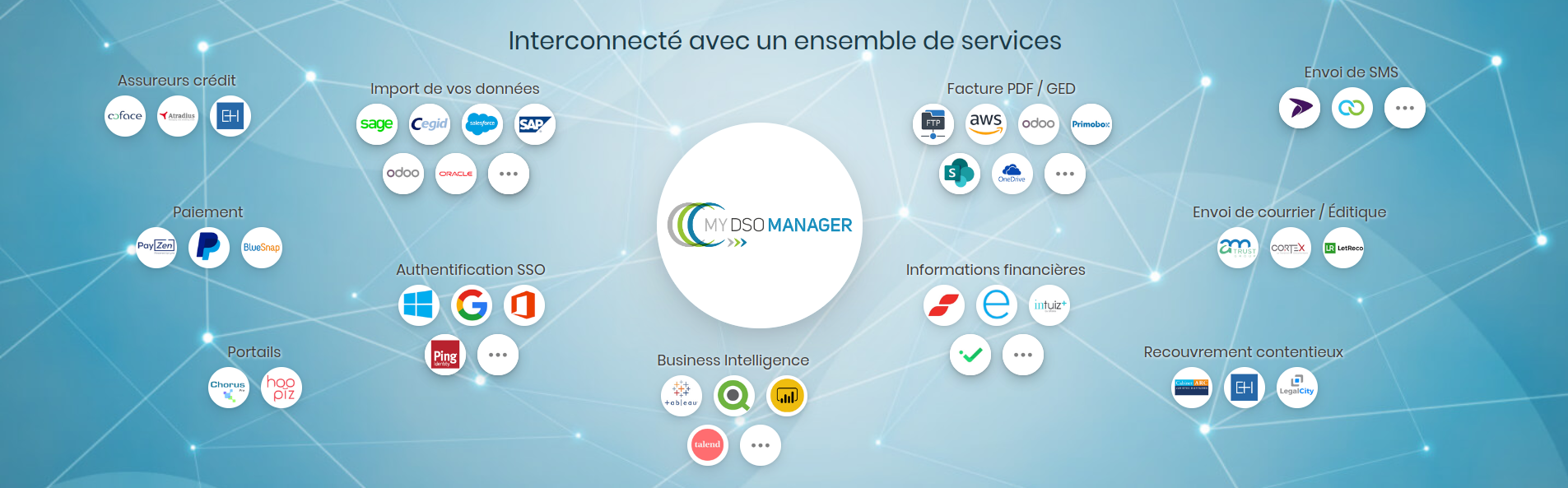 Que vous utilisiez des ERP, des CRM ou d'autres solutions comptables, My DSO Manager s'intègre facilement pour une expérience fluide et sans coût supplémentaire pour des développements spécifiques.