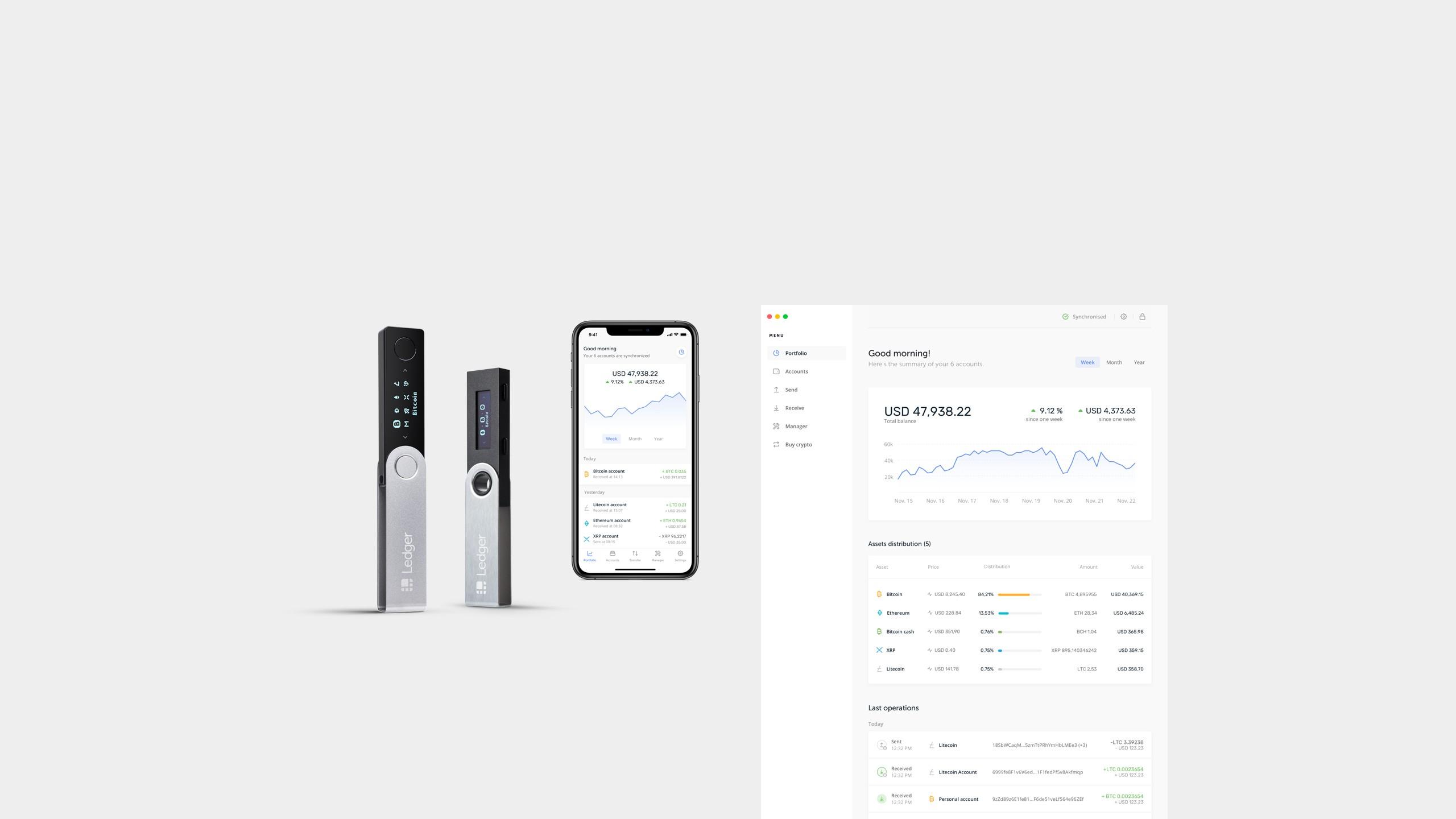 Lorsqu'un utilisateur achète des cryptomonnaies, il peut ensuite les stocker sur l'application Ledger Live. Cela lui permet de gérer ses portefeuilles,mais aussi de recevoir ou d'envoyer des cryptoactifs. Enfin il peut également accéder à des applications annexes utilisant les cryptomonnaies. L'utilisateur a le choix entre plusieurs portefeuilles, le Ledger Nano S, le Ledger Nano X et le Ledger Blue, qui proposent tous des solutions de stockage sécurisées, seules les modalités d'utilisation diffèrent.