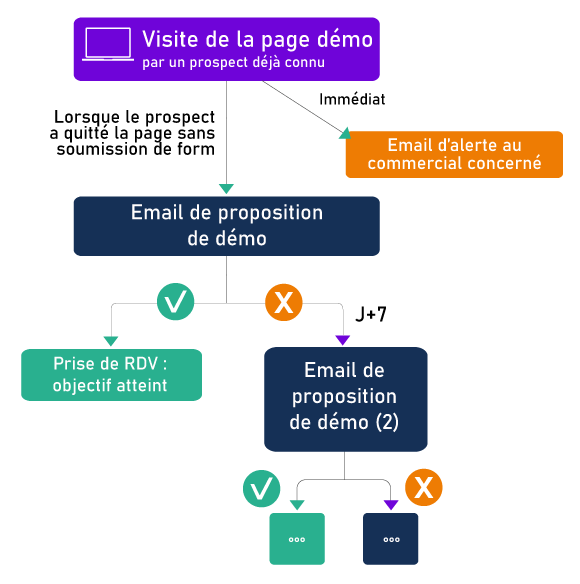 👉 Exemple : cela peut inclure l'envoi d'un e-mail de bienvenue à un nouvel abonné, ou la mise en place d'un suivi personnalisé après le téléchargement d'un contenu. Grâce à ce type d'automatisation, vous pouvez mieux gérer vos relations avec les prospects et clients tout au long du parcours d'achat, en leur proposant des interactions pertinentes, au bon moment.