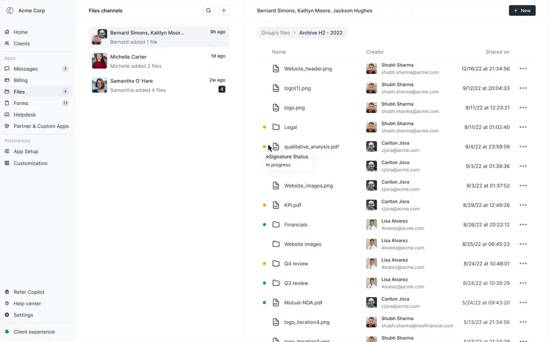 Grâce à Copilot, vous centralisez l’ensemble des interactions et documents commerciaux (contrats, factures, etc.) au sein d’une même interface, améliorant ainsi l’expérience de toutes les parties prenantes. Vous partagez également des informations importantes avec vos clients et suivez l'avancement de vos projets commun en temps réel dans des espaces d’échanges parfaitement sécurisés.