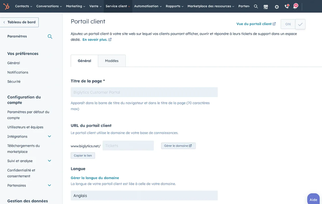 Parmi eux, on retrouve un portail client entièrement configurable (couleurs, logo, police, etc.), sans qu’il soit nécessaire de recourir à des développeurs. Le processus de création est hyper-intuitif ! De plus, ce portail est relié à votre boîte de réception partagée HubSpot, bien pratique pour fluidifier les échanges.