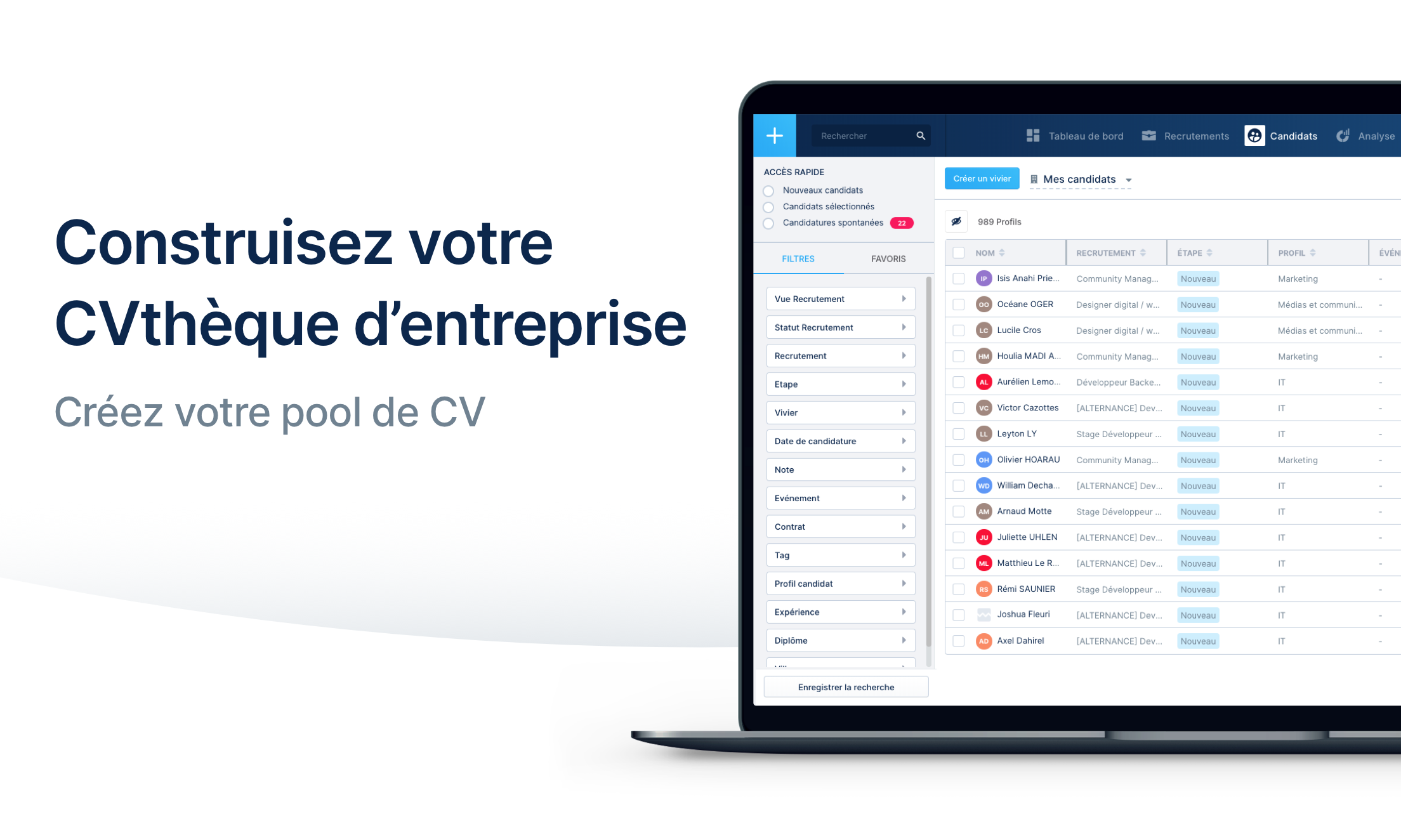 Oubliez l’époque où vous crouliez sous les CVs sans avoir le temps de les étudier, et où vous tentiez de maintenir un tableau Excel pour assurer un suivi des candidatures. Avec un logiciel de gestion de CV, vous ne passerez plus à côté du profil idéal, tout en gagnant du temps.