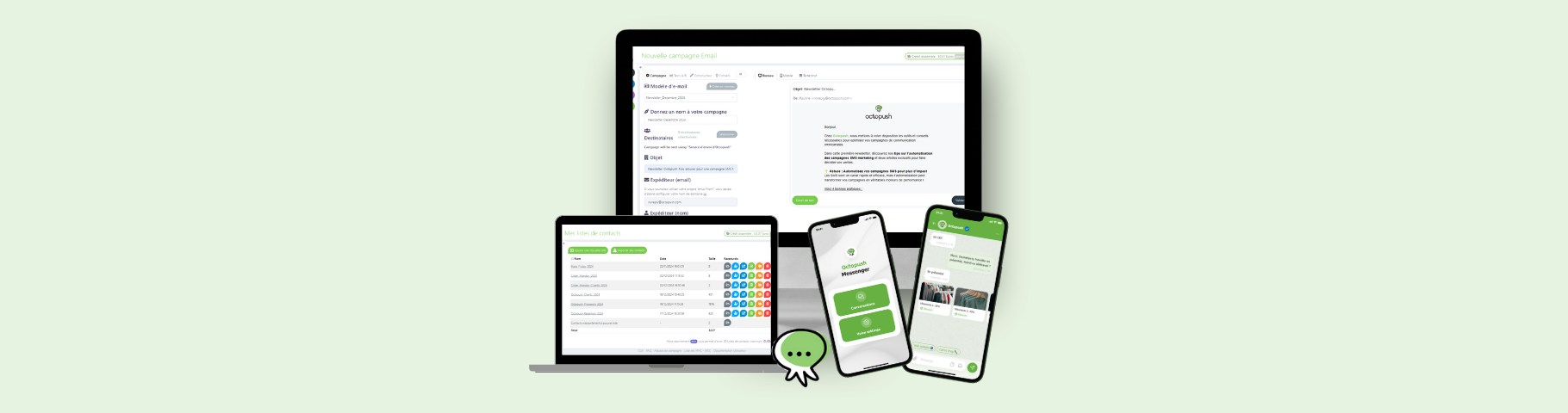Octopush regroupe tous les outils nécessaires pour gérer vos communications sur une seule interface. En plus des campagnes SMS, les fonctionnalités e-mail incluent :