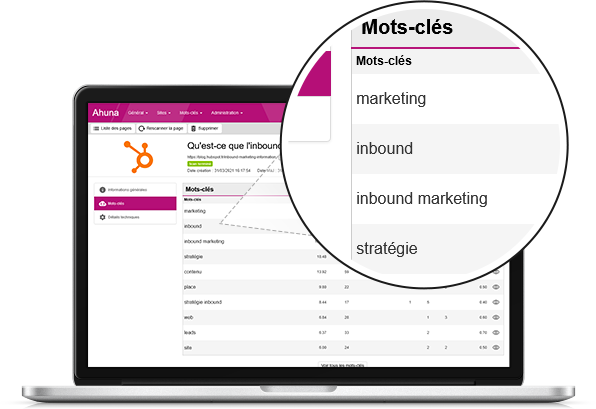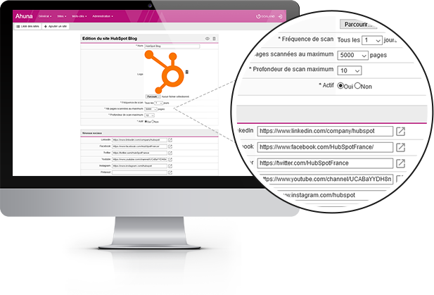 Ahuna est une plateforme d'Inbound Marketing. Elle propose des fonctionnalités avancées (gestion des scans, collecte et pondération automatique des mots-clés, statistiques, recherche avancée multicritères…) et permet de mettre en œuvre une veille concurrentielle pour optimiser la production de vos contenus. Ahuna donne également accès aux statistiques des sites web que vous suivez, détecte les mises à jour de contenus et nouvelles publications et vérifie les mots-clés de chaque page scannée.