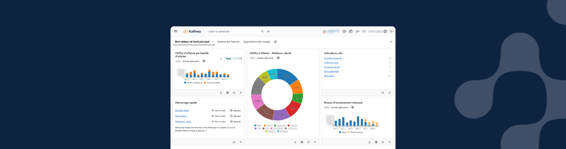 Kafinea - Pilotez l’ensemble de votre activité en temps réel grâce à des graphiques interactifs : chiffre d’affaires, encaissements, clients clés.
