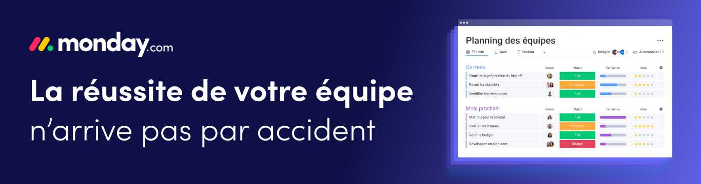 Ce qui distingue monday.com, c'est la variété d'options de personnalisation disponibles. Les utilisateurs peuvent adapter la plateforme et les workflows à leurs besoins, ce qui assure aussi que l'outil est fonctionnel et utile : c'est monday.com qui travaille pour vous ! Qu'il soit question de projets à grande échelle, ou d'optimisation de tâches quotidiennes, monday.com assiste les équipes qui souhaitent booster leur productivité et atteindre leurs objectifs efficacement et rapidement.