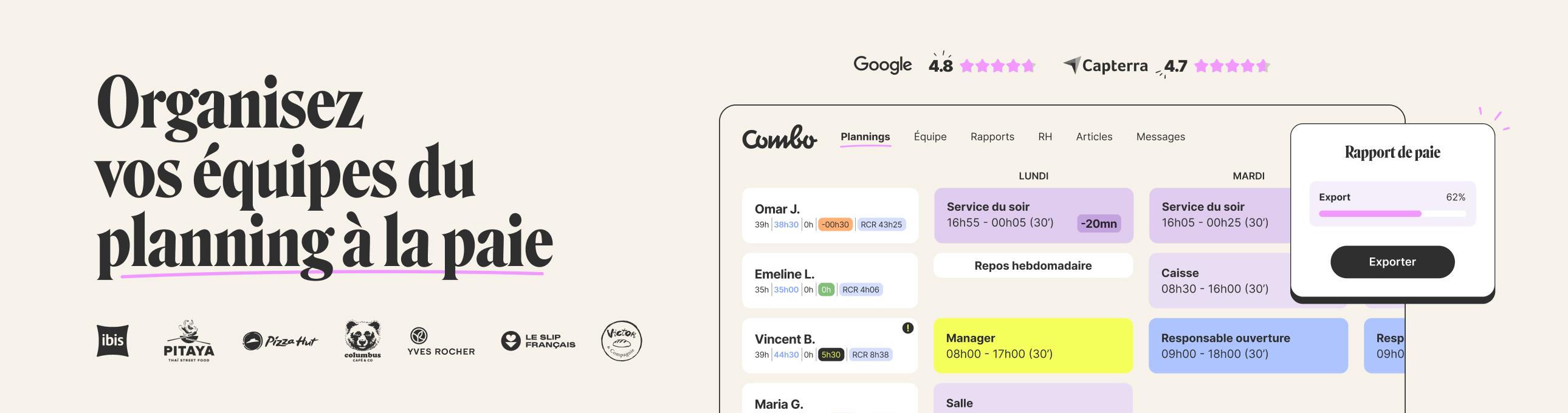 Finies les heures interminables à préparer les plannings et les communiquer à l’équipe. Avec Combo, ils sont créés, dupliqués et partagés en quelques minutes, tout en étant conformes avec votre convention collective et les contrats de vos salariés !