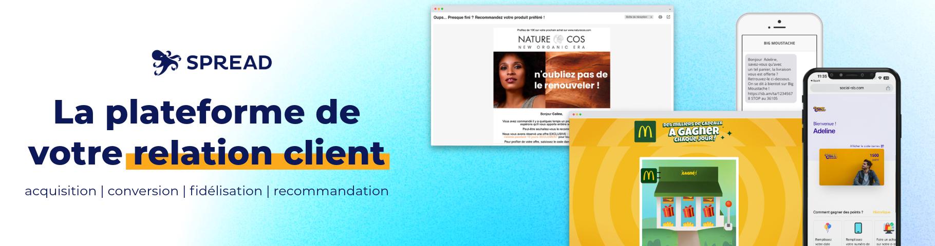 SPREAD est une de plateforme marketing française qui permet aux e-commerçants et retailers d'animer, convertir et fidéliser leurs clients grâce à :