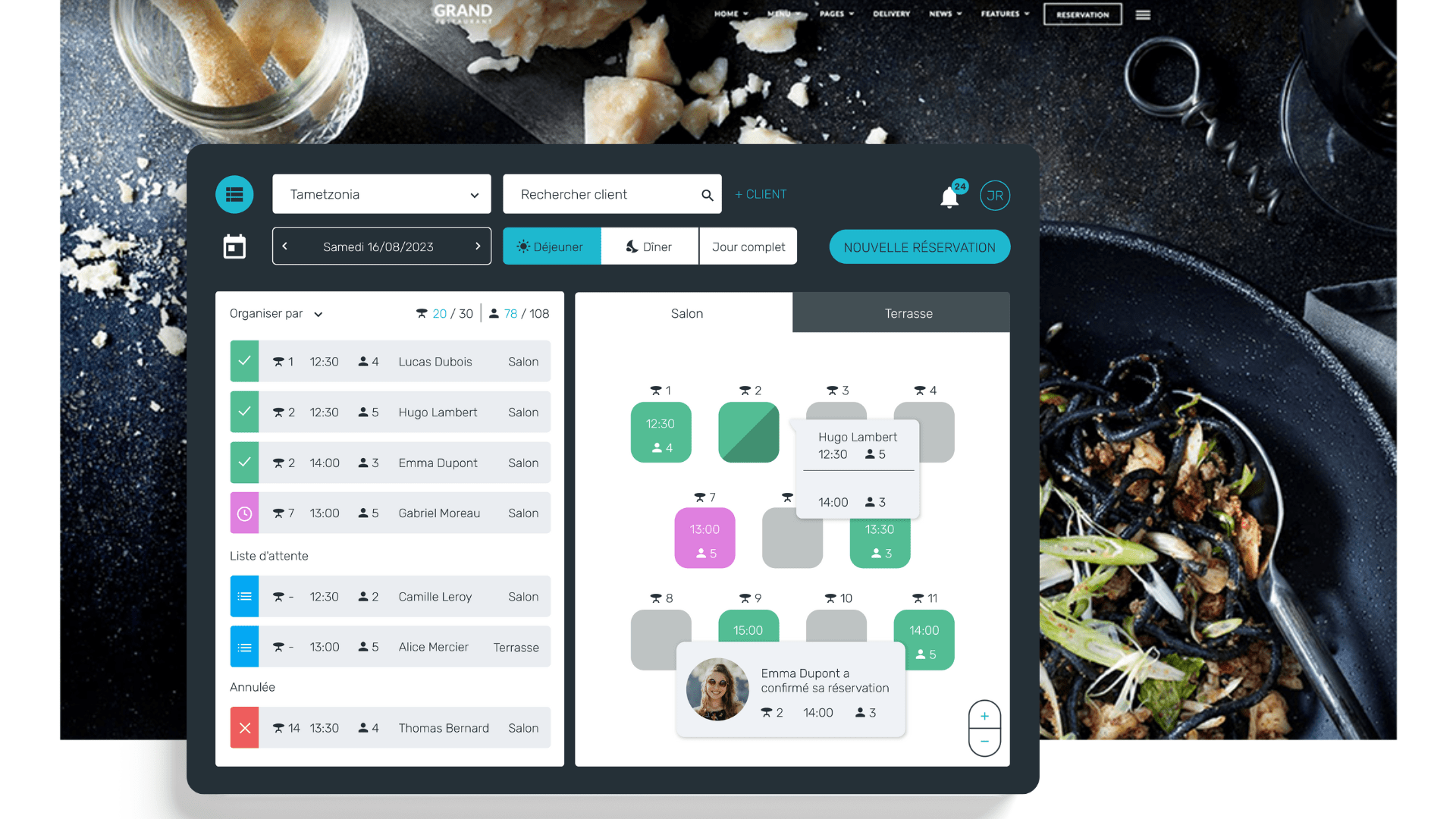 - Configuration dynamique des tables : Ajustez facilement votre plan de salle pour accueillir des groupes de différentes tailles.