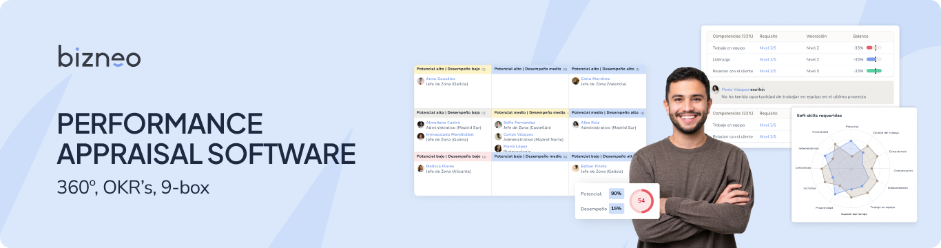 Bizneo Évaluation est un logiciel 100% en ligne qui offre les formulaires les plus efficaces pour les évaluations de performances et de compétences de votre équipe. En outre, choisissez et créez facilement des modèles : 360º, 180º ou top-down.