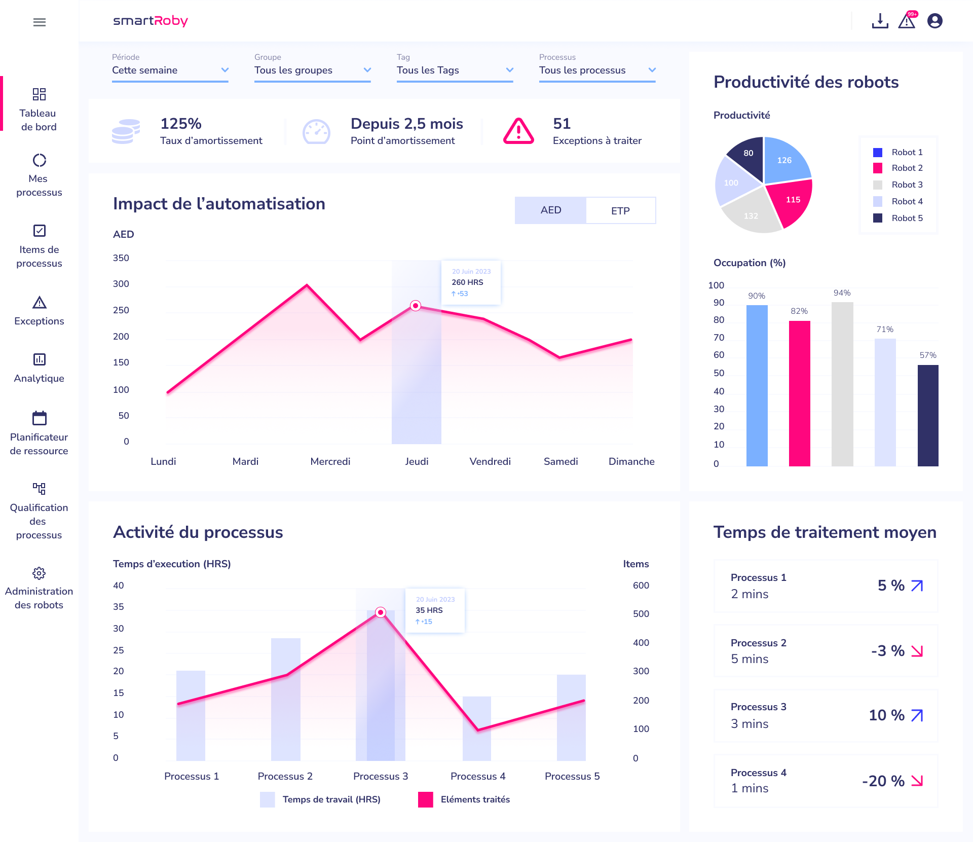 - Orchestration intelligente - Gestion des processus : Gérez et contrôlez tous vos processus automatisés hébergés sur SmartRoby