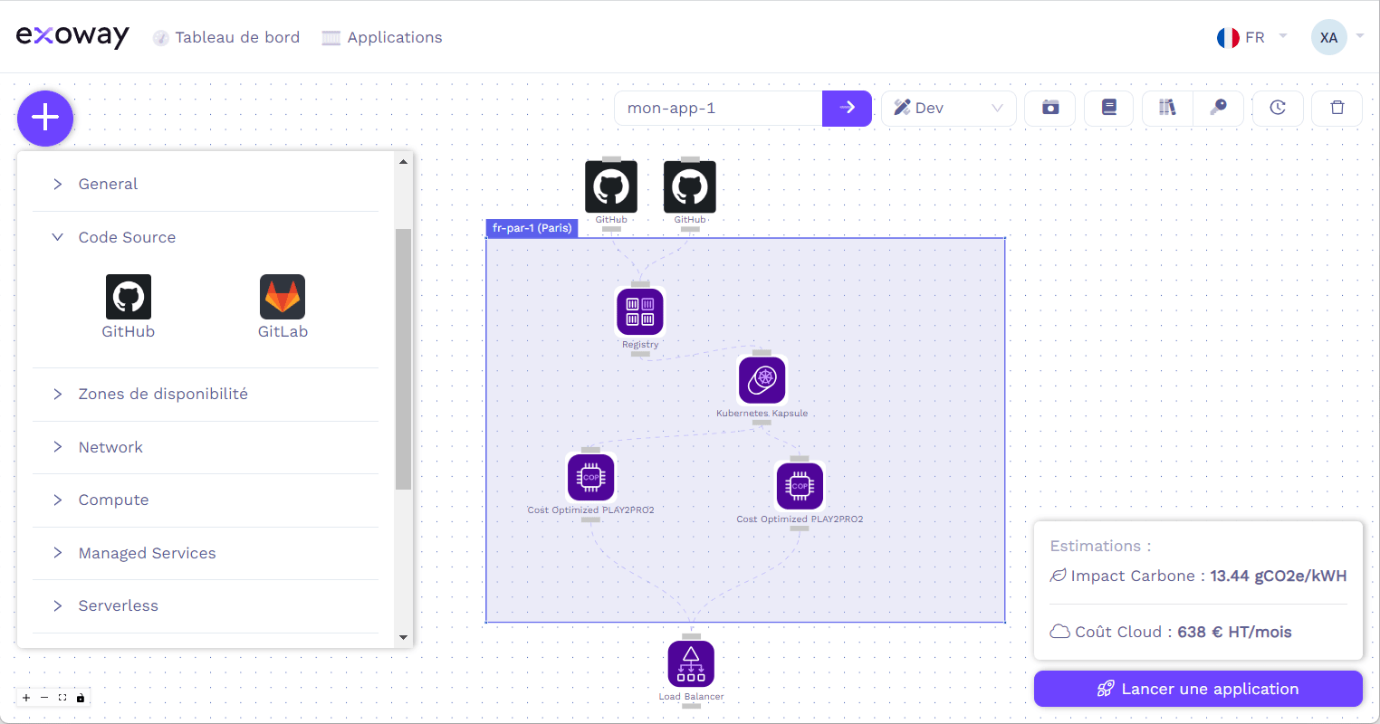 Grâce à son tableau blanc et au catalogue intégré des clouds, construisez votre schéma sur une page blanche en sélectionnant les composants du cloud. Exoway code pour vous les éléments.