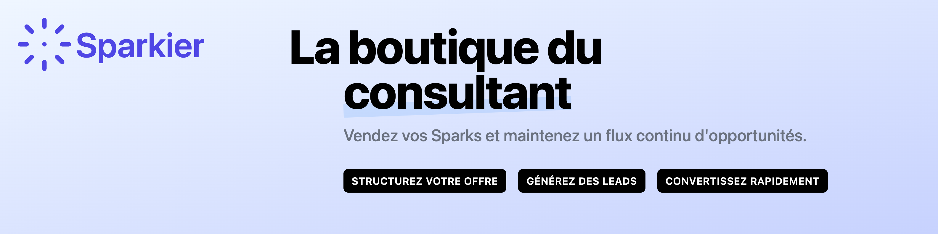 Sparkier est une solution e-commerce dédiée aux consultants et experts indépendants, conçue pour transformer leur expertise en offres packagées prêtes à vendre. La plateforme permet de créer une boutique de conseil en ligne avec prise de rendez-vous, paiement sécurisé et automatisations pilotées par intelligence artificielle.